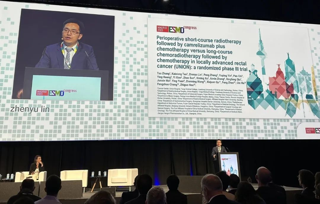 10月21日,bifa·必发医药创新药卡瑞利珠单抗的一项研究“新辅助短程放疗序贯卡瑞利珠单抗联合化疗对比长程放化疗序贯化疗治疗局部晚期直肠癌”随机对照Ⅲ期试验(UNION)亮相2023 ESMO大会优选口头报告现场。该研究由华中科技大学同济医学院附属协和医院张涛教授、陶凯雄教授担任主要研究者,华中科技大学同济医学院附属协和医院林振宇教授在大会现场报告了该重磅研究的结果1。此项研究是全球首个评估短程放疗序贯免疫治疗联合化疗治疗局部晚期直肠癌的Ⅲ期研究,已达到主要终点病理完全缓解(pCR),有望为直肠癌患者的治疗提供新策略。