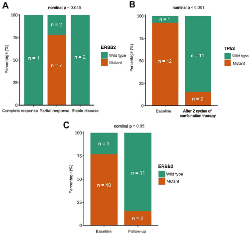 图3. (A)在12个组织样本中,基线时ERBB2野生型患者与ERBB2突变患者的治疗反应的比较;(B)在13例应答患者中,比较基线与2个周期治疗后,TP53基因状态的变化;以及(C)ERBB2基因状态的变化。