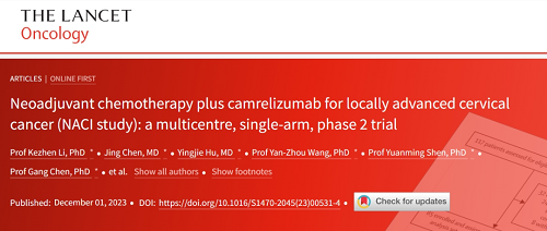 [1] Kezhen Li, Jing Chen, Yingjie Hu, Yan-Zhou Wang, Yuanming Shen, Gang Chen,Jihui Ai, Ding Ma,Chaoyang Sun,et al.Neoadjuvant chemotherapy plus camrelizumab for locally advanced cervical cancer (NACI study): a multicentre, single-arm, phase 2 trial.Lancet Oncol. Published:December 01,2023. DOI:https://doi.org/10.1016/S1470-2045(23)00531-4